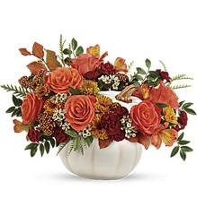 Bursting from an enchanting white ceramic pumpkin, this fabulous fall mix of roses and mums is a magical addition to your autumnal gatherings!