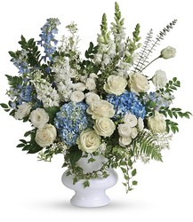 A treasured tribute to your beloved, this gorgeously grand bouquet of soft blue hydrangea and white roses is reminiscent of a clear sky, a hopeful reminder of life and love.