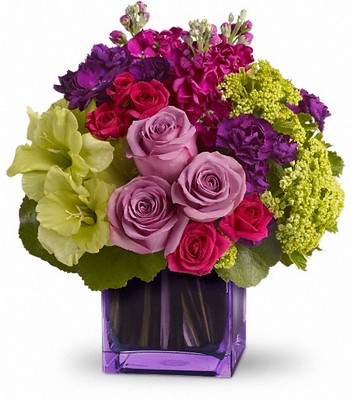 This enchanting mix of exquisite blossoms delivered in a modern cube is perfectly pretty and sure to please. No matter what the occasion, this brilliant blend of pinks and purples along with bursts of bright green is a true flower-wower. Approx. 12 1/2" H x 11 1/2" W