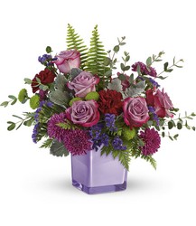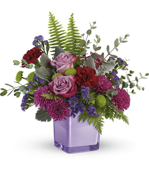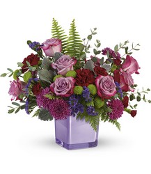 Soft and serene, this rich bouquet of lavender roses and moody maroon blooms is a touching gift any day of the week, especially presented in this stunning cube!