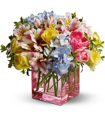 Springtime marks a renewal of everything beauteous that nature has to offer; and this medley of pastel blossoms in tender hues of pink, blue and yellow would work well for a table centerpiece at a baby or engagement shower, or as a birthday bouquet. The pink glass cube vase is a lovely bonus gift